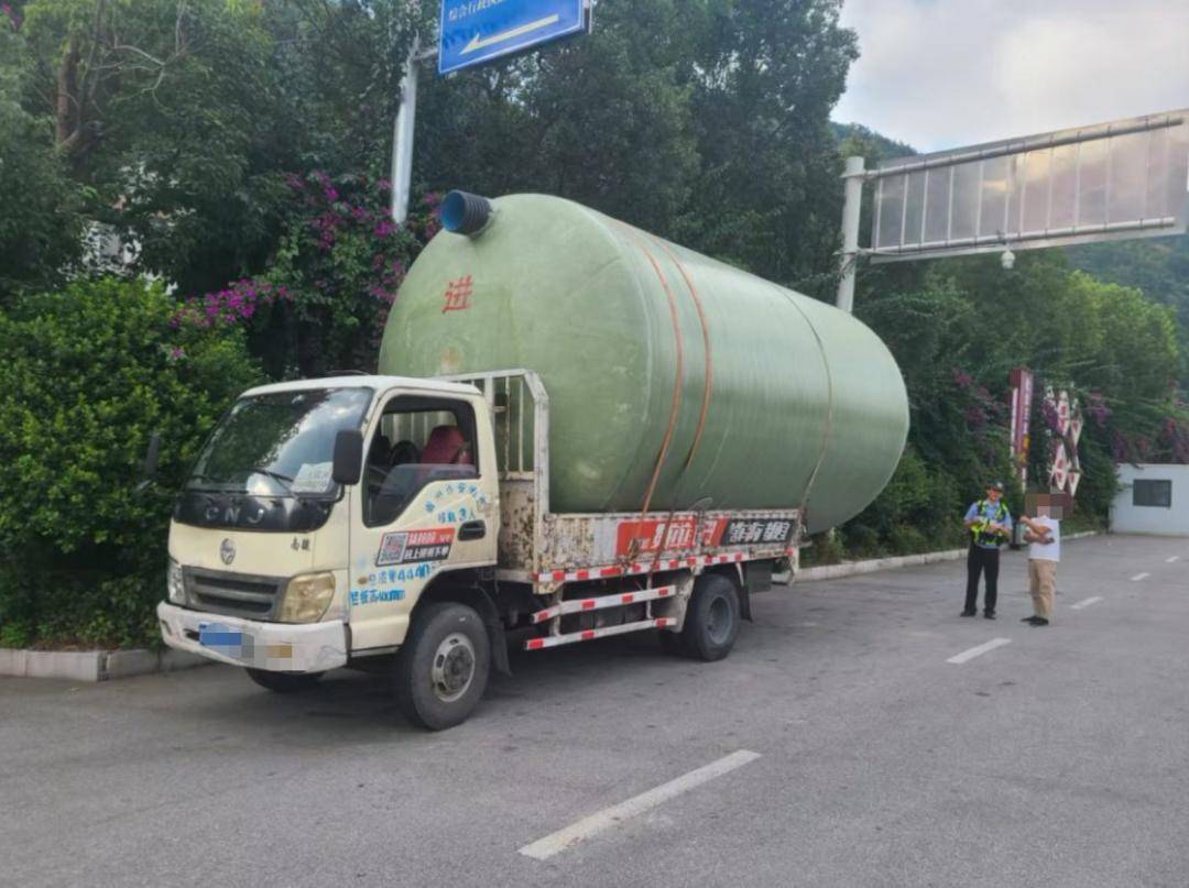 经仔细检查,该车所载货物为玻璃钢化粪池,存在明显的超高、超宽、超长问题,这不仅遮挡了驾驶员的视野,同时由于贵州高速的特殊,桥梁多、隧道多、弯道多,路上还有横风,一旦车辆发生侧翻或货物掉落,还将严重危及其他正常行驶车辆的安全。
